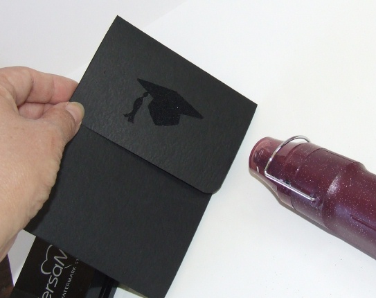 I stamped my graduation cap image using Versamark ink and poured black embossing powder on it and heat embossed. You could also use clear embossing powder but I couldn't find mine (or ran out). Clear would be more versatile if you chose another cardstock for the card.